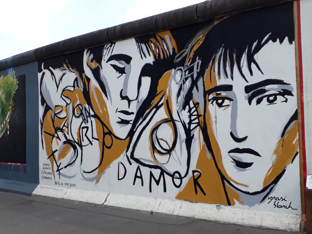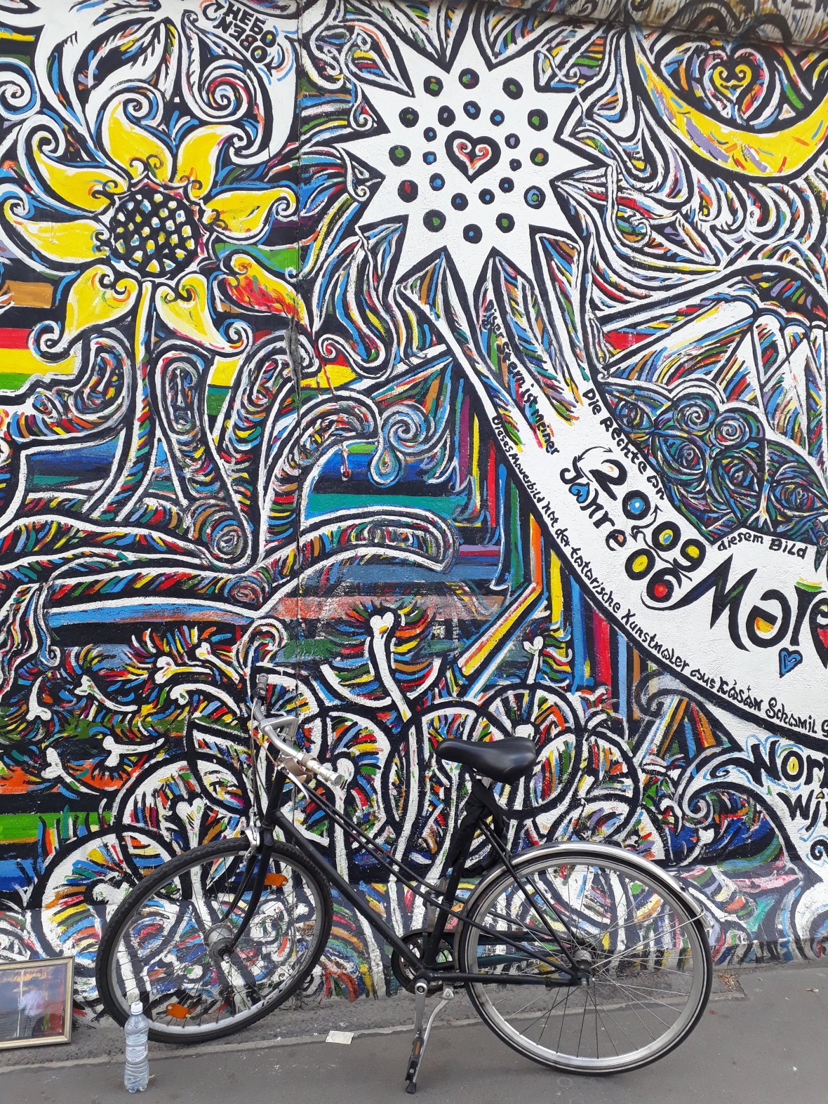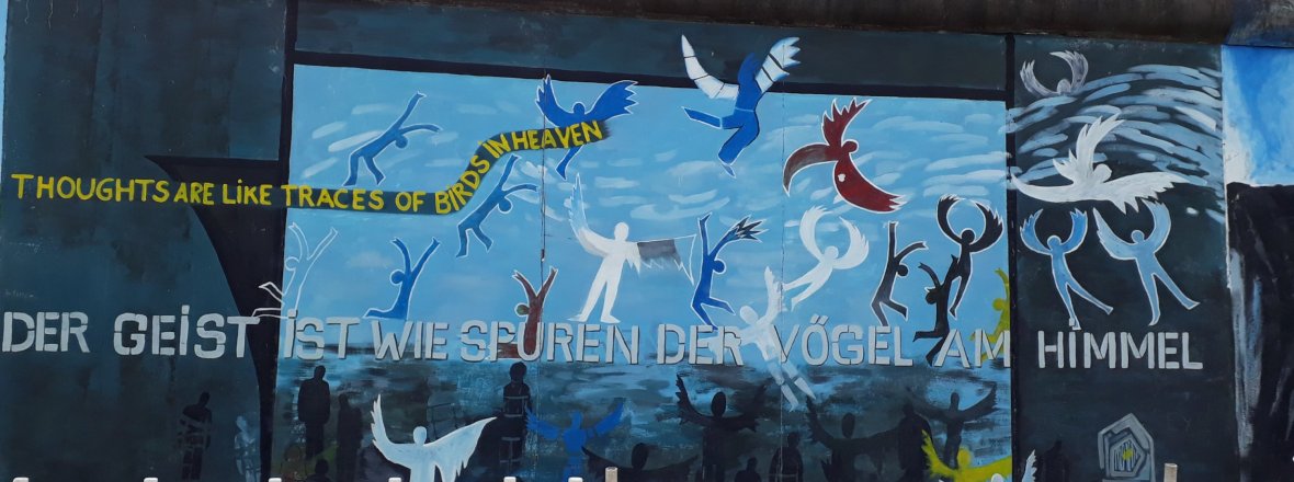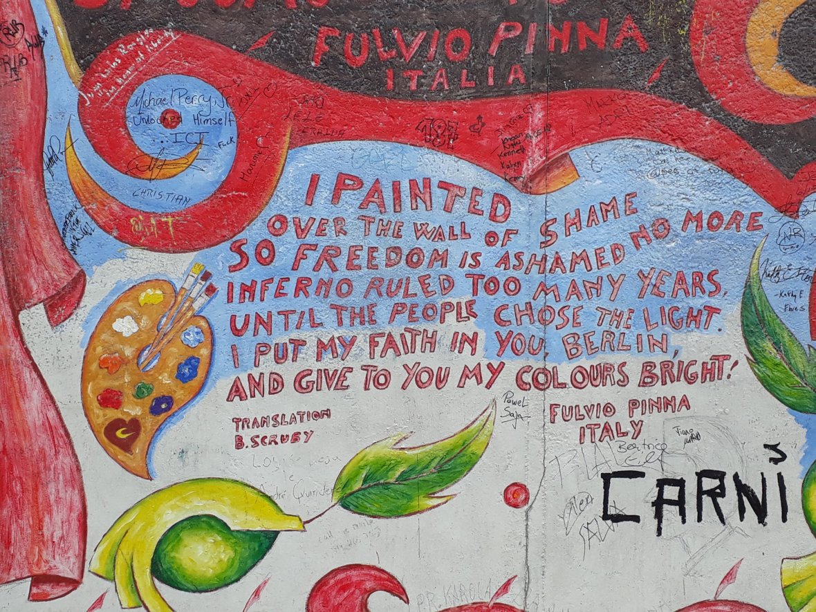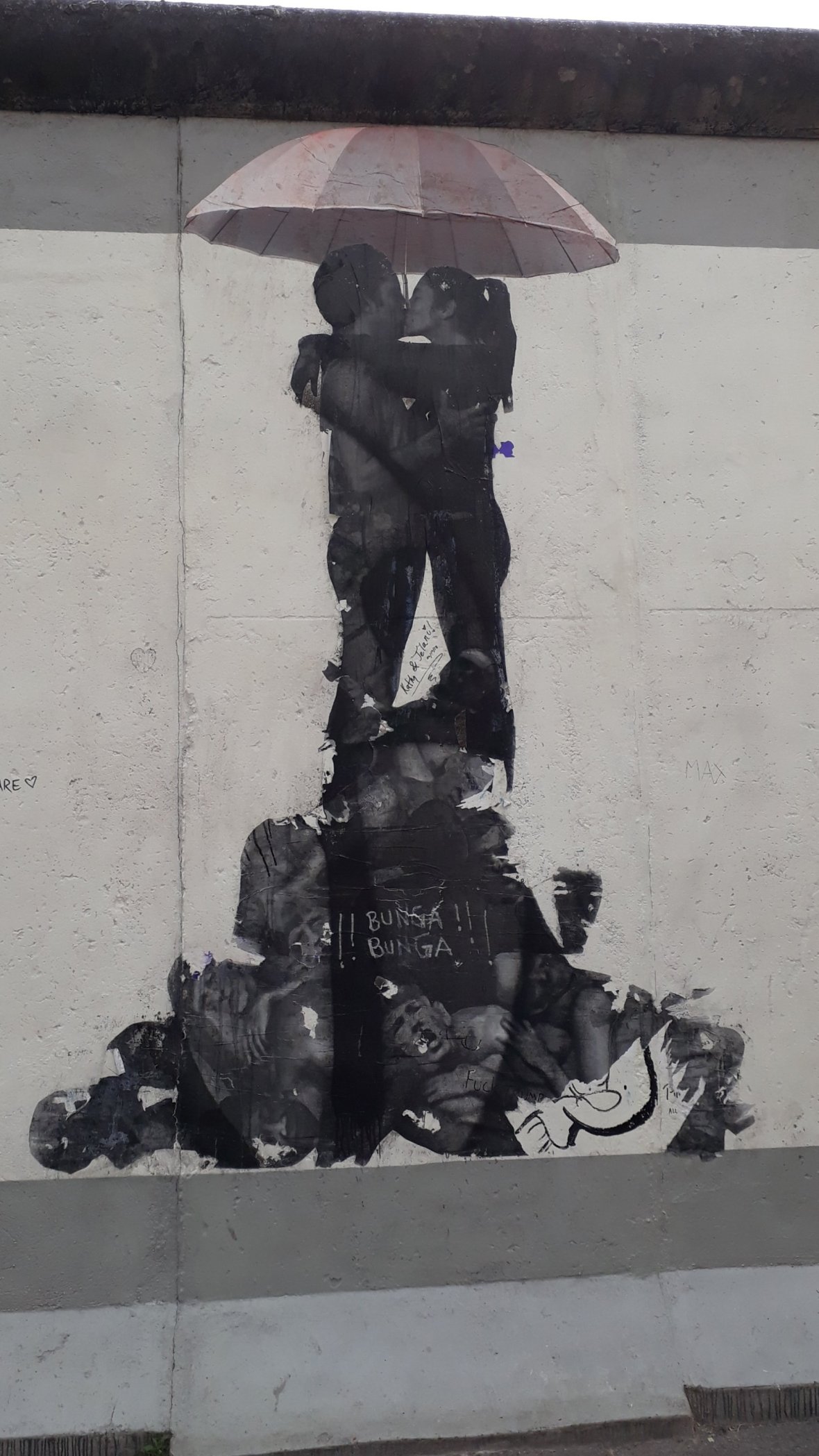 Uma emoção, uma surpresa. Quando cheguei ali por acaso comecei a trocar mensagem com um amigo alemão. Ele disse que a mãe tinha pintado um painel no muro. Pedi para ele mandar uma foto ou descrever. Ele não tinha foto e era difícil descrever o desenho, mas enviou a frase em alemão, a mesma que colocou na lápide da mãe. Enquqnto percorria o muro procurava identificar as palavras. Achei! Mandei a foto. Foi muito especial. Emocionante dividir isso com ele. Não vou identificar o painel, é muito pessoal. Não é esse aí debaixo.