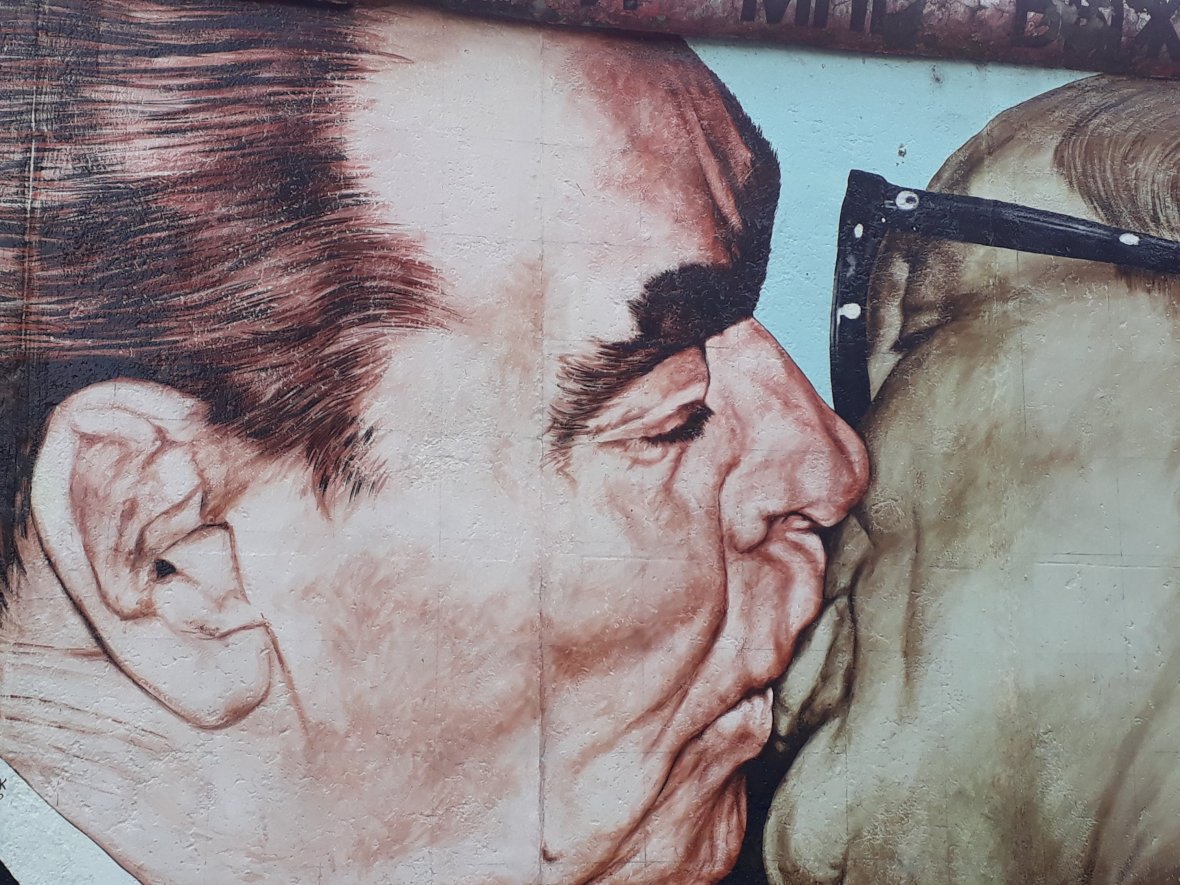 E tem o beijo mais famoso do muro em close-up. Talvez os dois líderes vermelhos tenham se empolgado um pouco no encontro. Quem dera fosse esse, um beijo de amor!